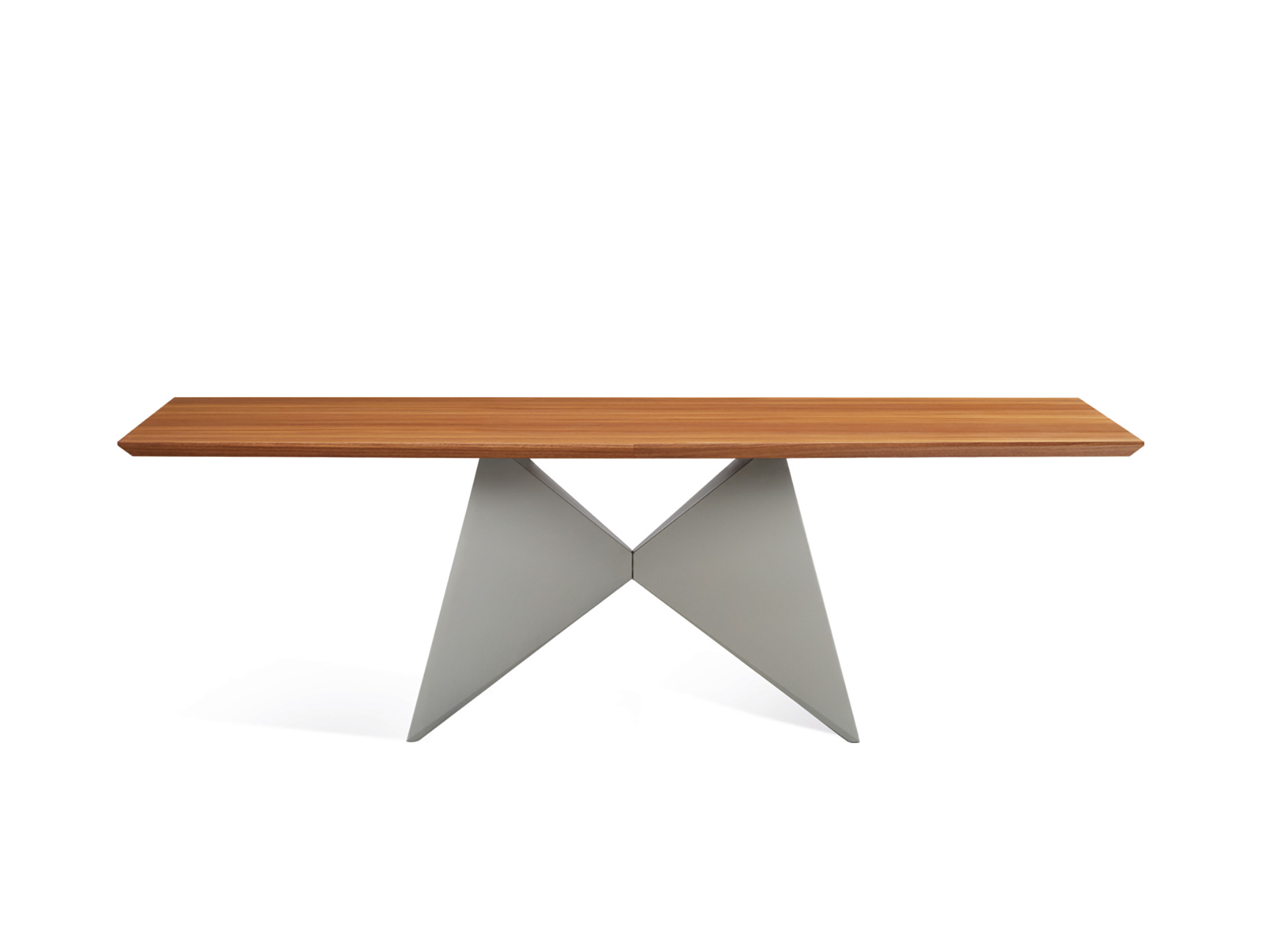 Tavolo dal carattere originale e scultoreo. La specularità dei due solidi gemelli posti alla base del tavolo lo rende un elemento d’arredo con una forte personalità ed uno spiccato equilibrio estetico.